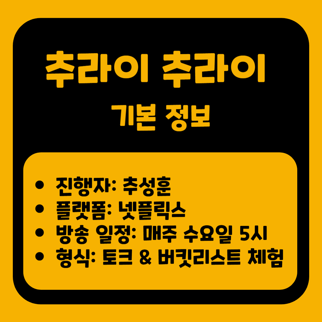 넷플릭스에서 새롭게 선보이는 '추라이 추라이'는 이종격투기 선수이자 방송인인 추성훈이 진행하는 토크 버라이어티 쇼입니다. 이 프로그램에서는 다양한 게스트와 함께 버킷리스트를 체험하며, 평소 보기 어려웠던 그들의 솔직한 모습을 담아냅니다.
