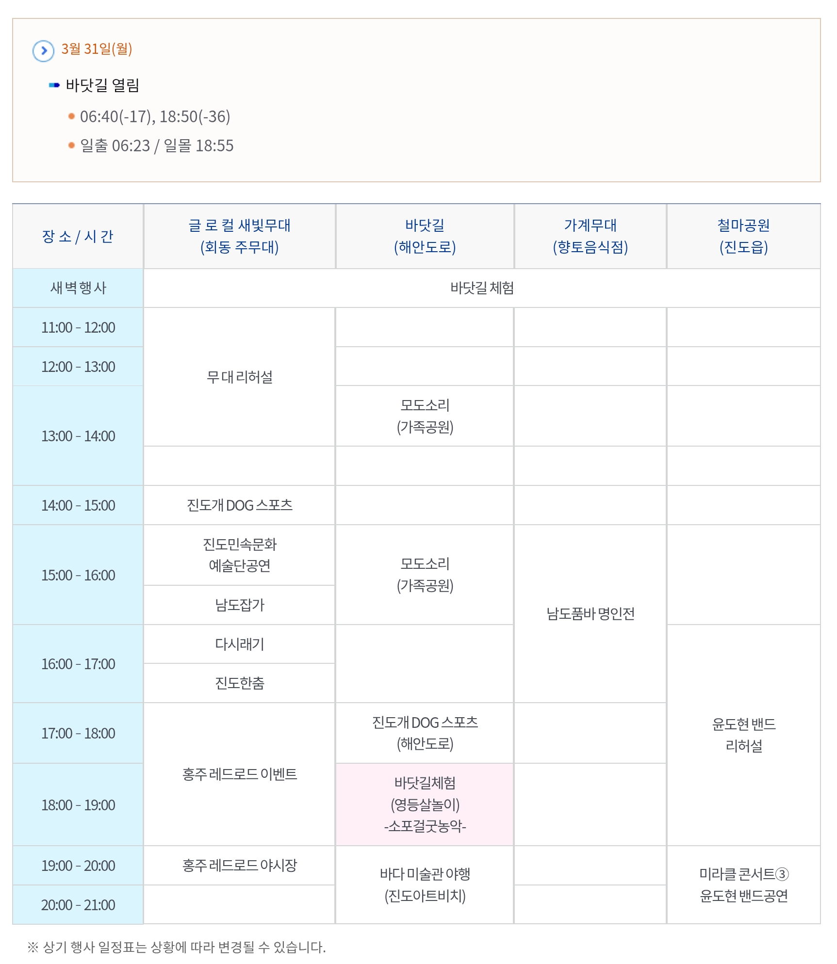 ※ 해수위에 따라 시간이 약간 달라질 수 있으니 현장 공지 꼭 확인하세요.