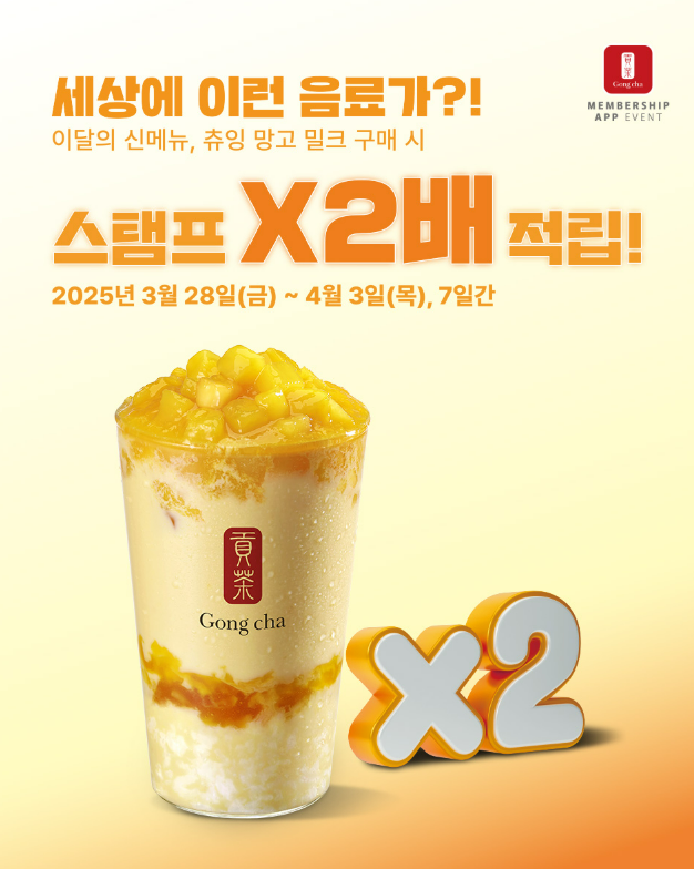 🥭 공차 – 신메뉴 ‘츄잉 망고 밀크’ + 스탬프 2배